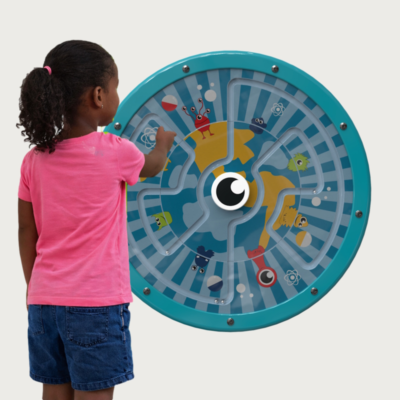 Dit mooie ronde wandspel Cosmic journey uit onze Monster collectie is een wandspel waarbij kinderen bepalen welke reis de monsters maken door het universum. Door te draaien aan het oog rollen de balletjes door de paden.